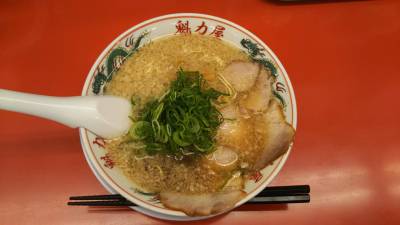 豚の背脂を浮かせた醤油ベースのスープと平打ち麺が特徴。